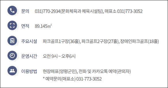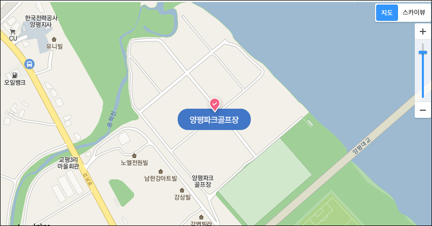 - 주소 입력 시 양평 파크골프장 또는 강상면 교평리 419번지를 이용하시면 됩니다.