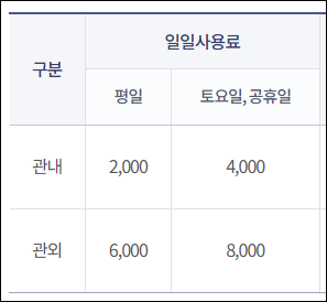 | 구분 | 평일(개인) | 평일(단체) | 토요일/공휴일(개인) | 토요일/공휴일(단체) |