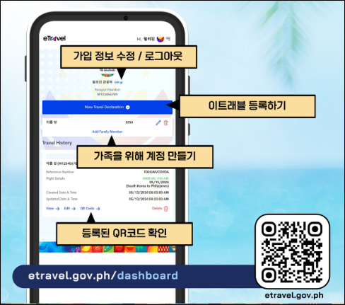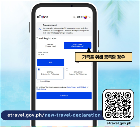 필리핀 이트래블은 가족 단위 여행자도 한 계정으로 모든 구성원의 등록이 가능합니다. 다만, 각 가족 구성원은 개별 QR코드를 반드시 발급받아야 하며, 미성년자도 예외가 없습니다.