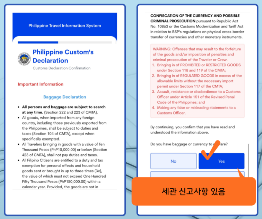 필리핀 이트래블(eTravel) 시스템에는 전자 세관신고서 작성 절차가 포함되어 있습니다. 이 전자 세관신고서는 기존 종이 세관신고서를 대체하며, 입국 전 온라인으로 간편하게 제출할 수 있습니다. 세관신고서는 모든 여행자가 작성해야 하며, 신고할 품목이 있든 없든 반드시 등록이 필요합니다.