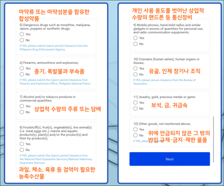 - 담배, 주류, 식물, 동물, 현금(한도 초과 시), 기타 반입 금지 또는 제한 품목이 있을 경우 해당 항목에 체크하셔야 합니다.