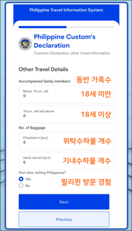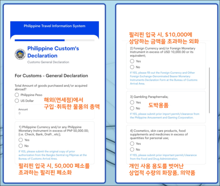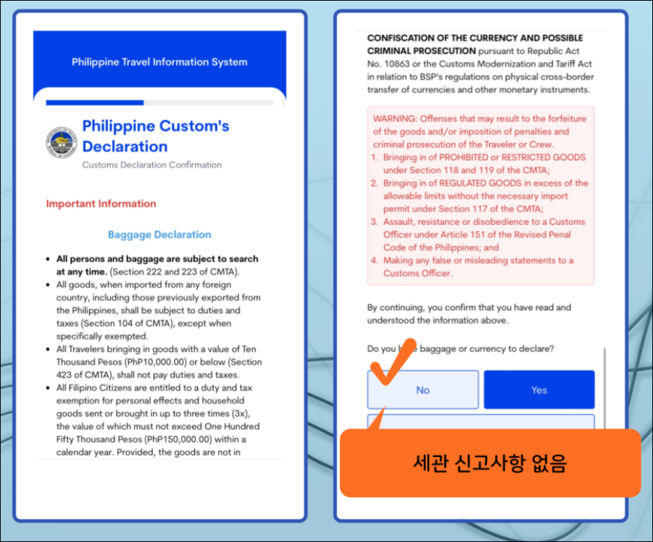필리핀 이트래블(eTravel) 시스템에는 전자 세관신고서 작성 절차가 포함되어 있습니다. 이 전자 세관신고서는 기존 종이 세관신고서를 대체하며, 입국 전 온라인으로 간편하게 제출할 수 있습니다. 세관신고서는 모든 여행자가 작성해야 하며, 신고할 품목이 있든 없든 반드시 등록이 필요합니다.