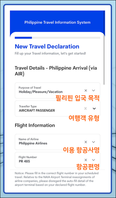 - 동반 가족 수, 수하물 개수, 여행 목적 등 기본 정보를 추가 입력해야 합니다.