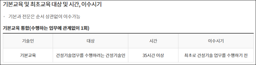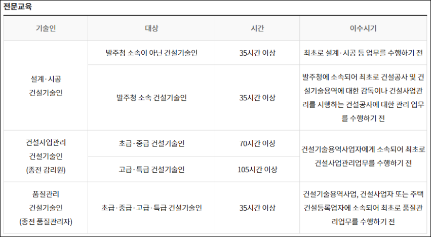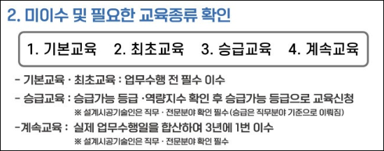 - 건설기술자 법정교육: 건설기술진흥법에 따라 등록된 건설기술자는 3년마다 필수 교육을 이수해야 함.