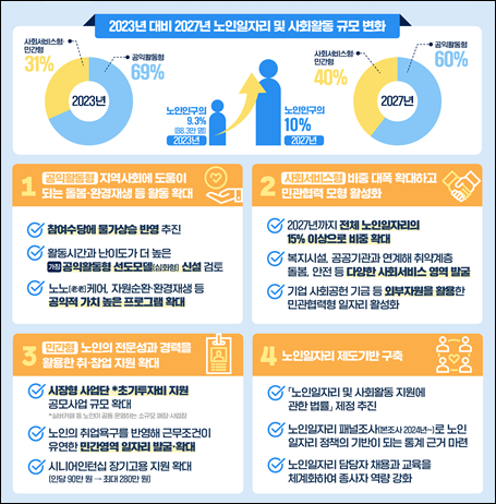 - 노인일자리 및 사회활동 지원 사업 (공익형, 사회서비스형, 시장형 등)