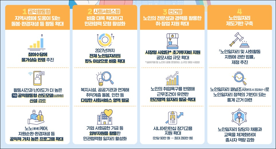 - 노인일자리 및 사회활동 지원 사업 (공익형, 사회서비스형, 시장형 등)