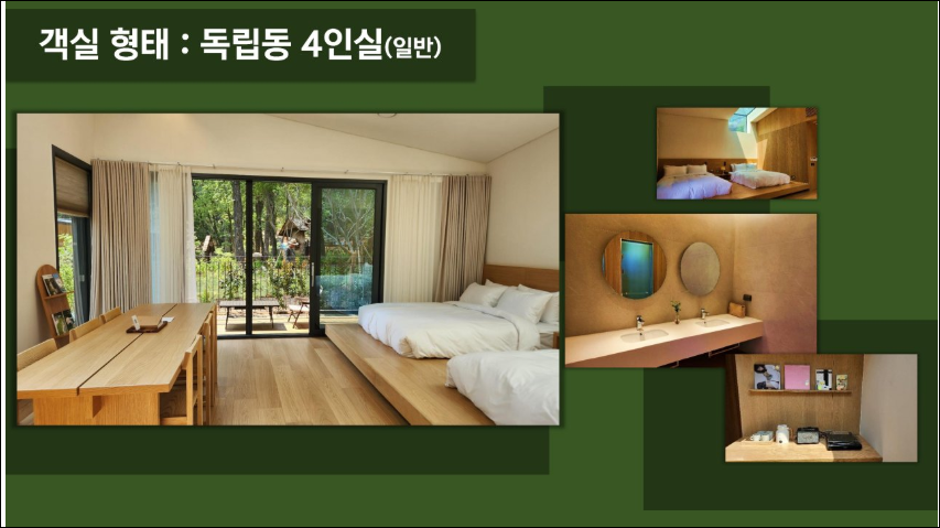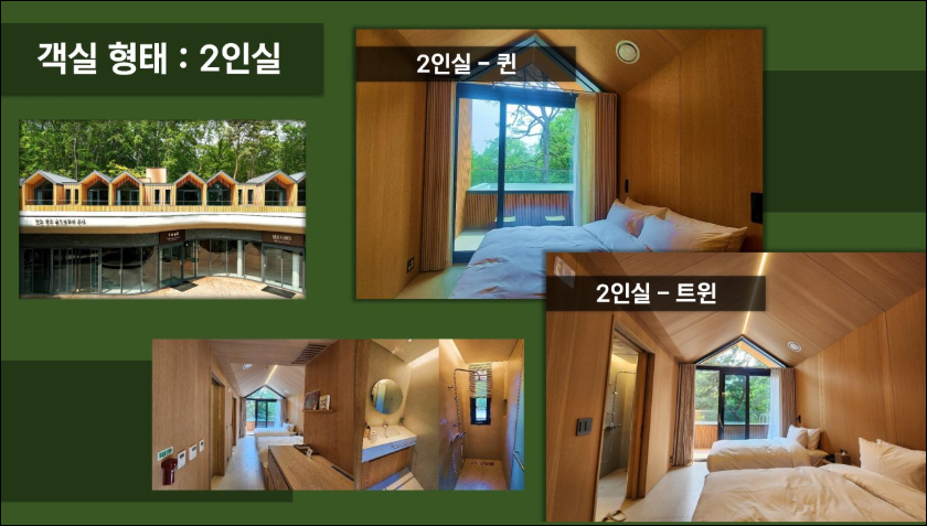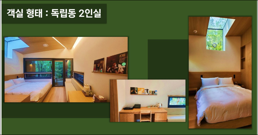 객실 창을 열면 숲내음이 스며들고, 새소리와 나뭇잎 스치는 소리가 은은하게 들려옵니다.