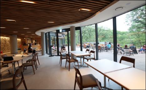 카페 숲속 카페테리아 신선한 커피와 음료, 숲속 휴식 공간