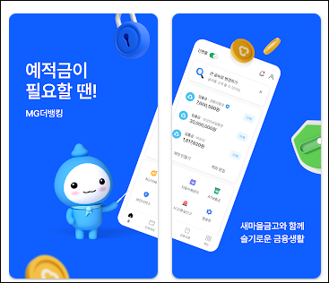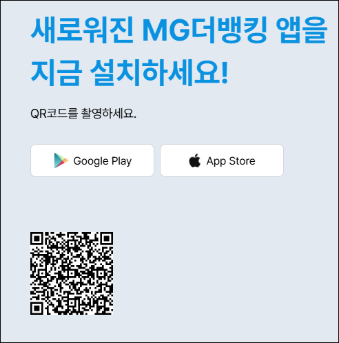 - 새마을금고 모바일 앱은 구글 플레이스토어 또는 애플 앱스토어에서 'MG새마을금고'를 검색하여 다운로드할 수 있습니다.