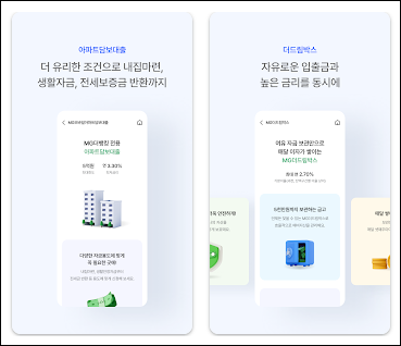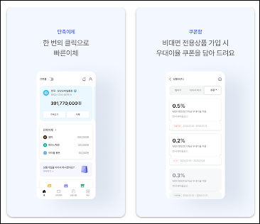대출 상환, 예금 금리 조회 및 대출 상품 신청 등 다양한 금융 상품을 관리할 수 있습니다. | 대출금 상환 및 예금 관리가 용이하며, 필요한 금융 상품을 손쉽게 조회하고 가입할 수 있습니다. |