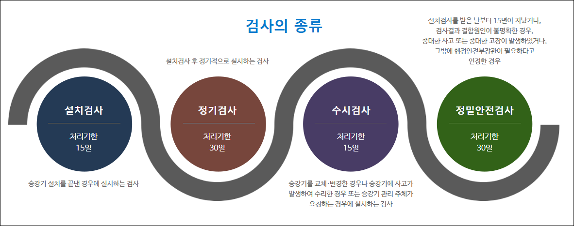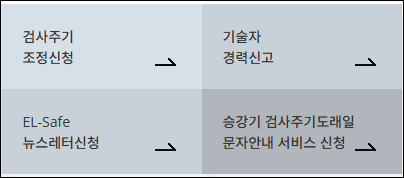 | 승강기 검사신청 | 정기검사, 수시검사, 설치검사 신청 및 결과 조회 |