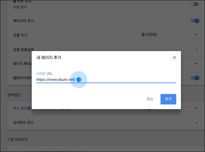 - 크롬 홈버튼도 다음으로 설정하려면 설정 > 모양 > 홈 버튼 표시 > 사용자 정의 웹 주소에 https://www.daum.net 입력