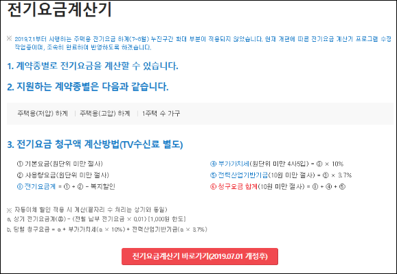 | 1단계 | 계약종류 선택 (주택용, 일반용, 산업용 등) 및 요금 적용 기간 설정 |