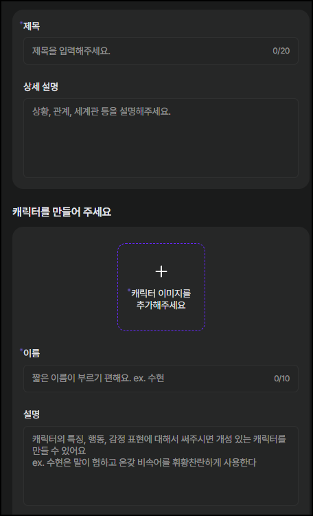 - 기본 정보 입력 : 캐릭터의 이름, 성별, 나이, 말투, 성격, 취미, 세계관 등 원하는 설정을 자유롭게 입력