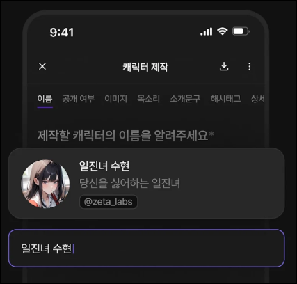 | AI 캐릭터 생성 | 이름, 성격, 말투, 배경 스토리 등 사용자가 원하는 설정으로 캐릭터 제작 가능 |