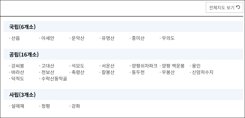 | 강씨봉자연휴양림 | 가평군 북면 적목리에 위치한 공립 휴양림으로, 980ha의 울창한 천연림과 아름다운 경관을 자랑합니다. | |