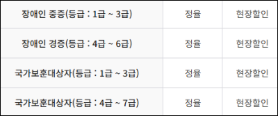 | 장애인 | 무료 | 장애인 증명서 또는 복지카드 제시 | |