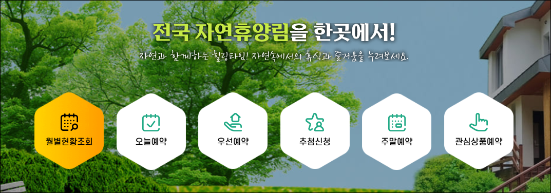 - 예약 신청: 매월 1일 오전 9시부터 7일 자정까지, ‘국립자연휴양림 예약통합시스템’에서 희망 날짜와 숙소를 선택해 예약 신청을 합니다.
