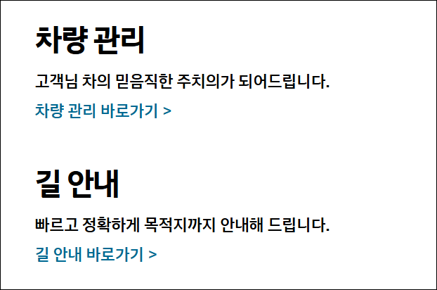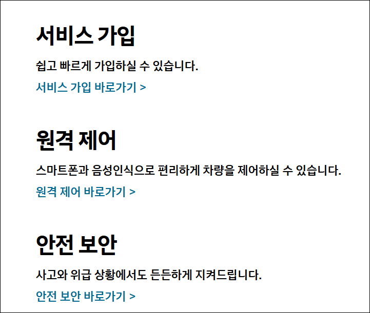 블루링크 홈페이지에서는 다음과 같은 디지털 고객 서비스를 제공합니다. 이러한 구성은 블루링크를 처음 접하는 사용자뿐 아니라 기존 사용자에게도 유용한 정보를 체계적으로 제공합니다.