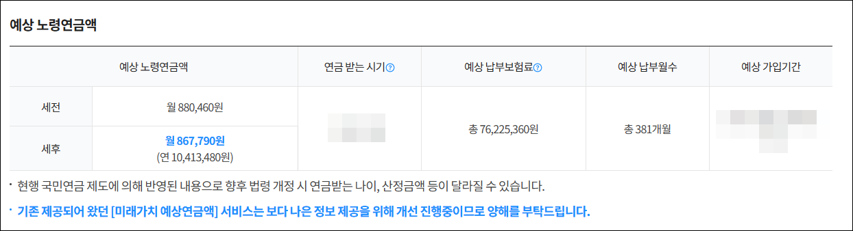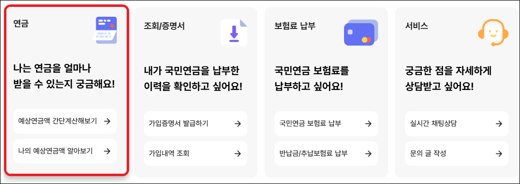 - 가입 기간과 보험료 납부 내역을 바탕으로 산출된 예상연금액을 조회할 수 있습니다.