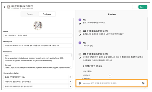 • Custom GPTs 사용 가능: 개인 맞춤형 GPT 제작 및 활용