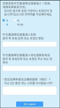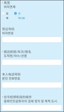 - 입국 목적: 여행(旅游), 비즈니스(访问/商务), 친척방문(探亲) 등 선택