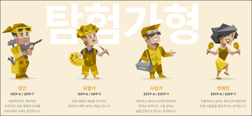 | ISFP | 호기심 많은 예술가 | 감성적, 온화함, 미적 감각, 유연한 사고 |