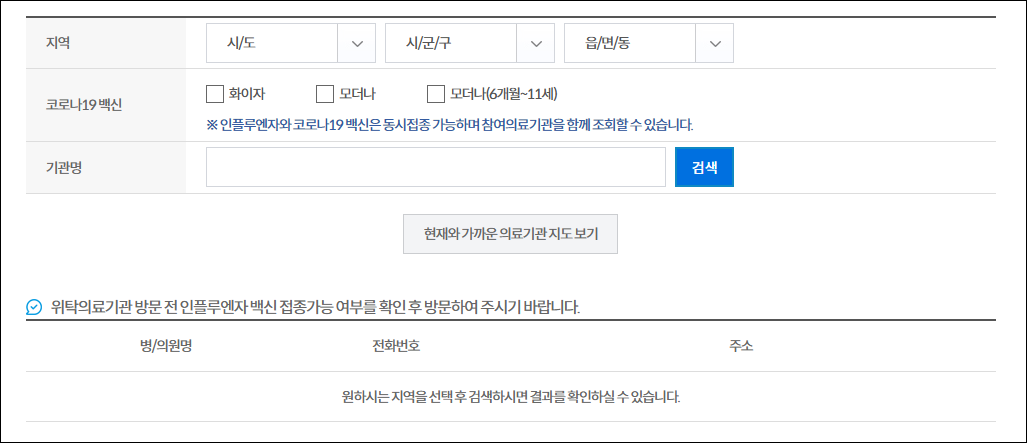 - 검색 방식 - 지역별 또는 의료기관 이름으로 검색 가능