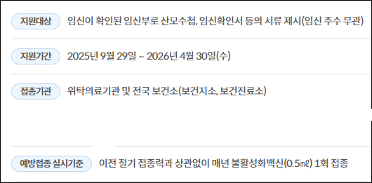| 1회 접종 어린이 및 임신부 | 2025년 9월 29일 | 2026년 4월 30일 | 9세 이상~13세 및 모든 임신부 대상 |
