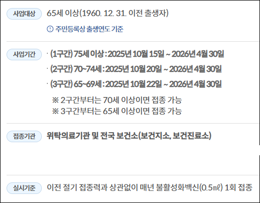 | 75세 이상 어르신 | 2025년 10월 15일 | 2026년 4월 30일 | 연령별 접종 시작일 차등 적용 |