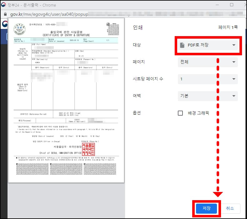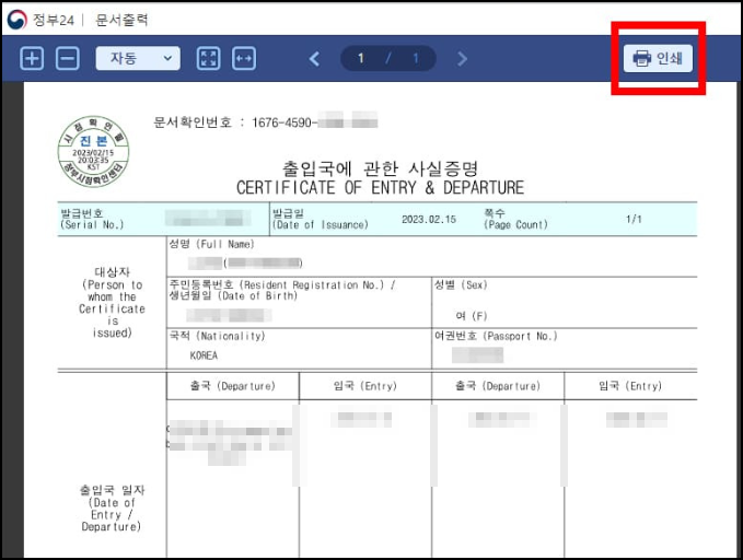 - 신청이 완료되면 즉시 PDF 형식의 출입국사실증명서를 다운로드할 수 있습니다.