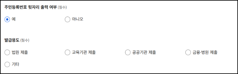 - 발급 유형 선택: 사용 목적에 따라 '출입국 사실 확인' 또는 '출국 사실 확인' 중 선택