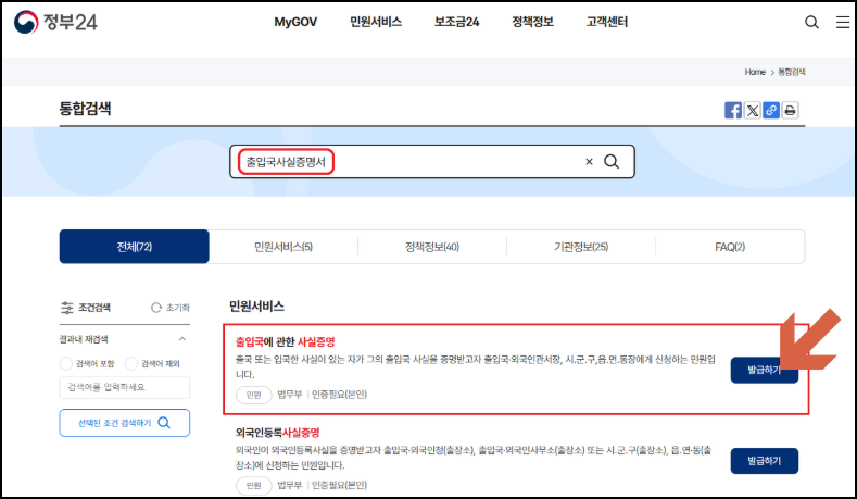 - 상단 검색창에 ‘출입국사실증명’을 입력하고 검색합니다.